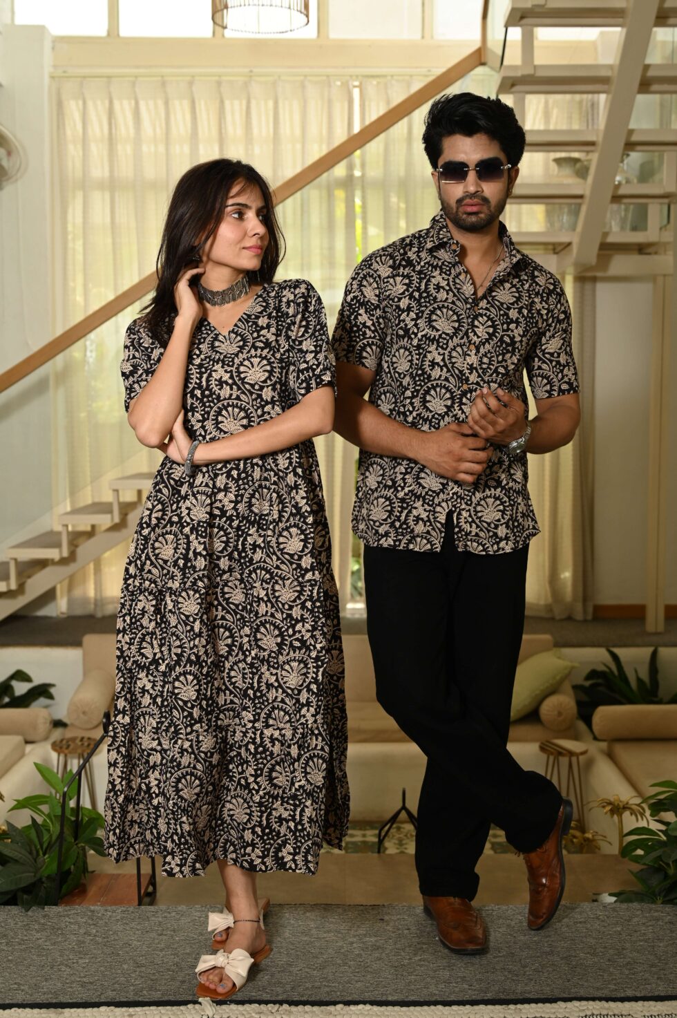 This Black floral Printed couple matching outfit includes a women?s flowy cotton midi dress and a men?s short-sleeve printed shirt. Designed with cheerful floral prints, this set is perfect for summer outings, casual gatherings, or twinning on vacations.