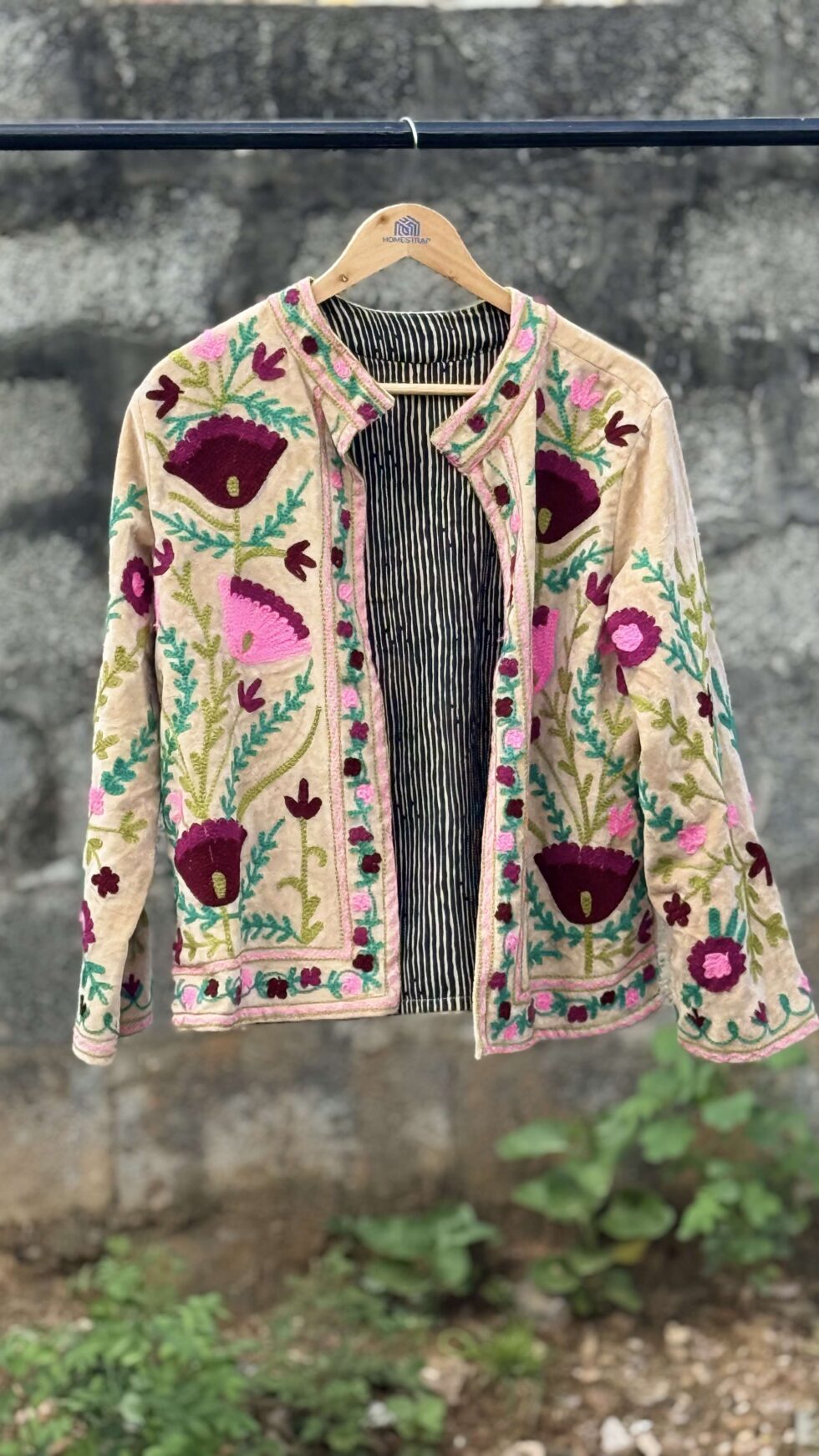 Womens Light Beige Velvet Embroidered Jacket with Floral Design